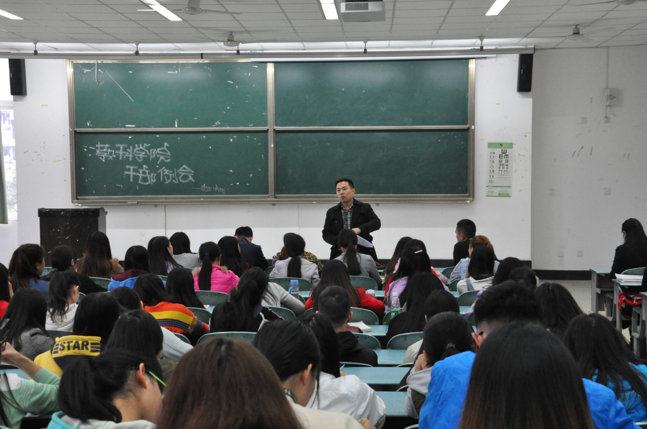 11月5日下午,教科学院于行知楼301教室召开了全院学生干部大会,学院党总支书记杨霞、副书记何永红、学生科长宋军、学生辅导员以及学院全体学生干部150余人参加了此次大会。