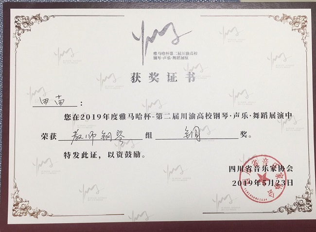 据悉,由来自四川师范大学、重庆师范大学、成都师范学院、成都大学、长江师范学院等20余所高校的数十名教师组成的比赛队伍中,既有国内专业音乐院校培养的老师,也不乏留学归国人员和外籍教师,竞争异常激烈,很大程度上体现了川渝两地高校钢琴教师的真实水平。比赛中田苗老师不畏强手、沉着冷静,正常发挥了自己的水平最终斩获了铜奖。