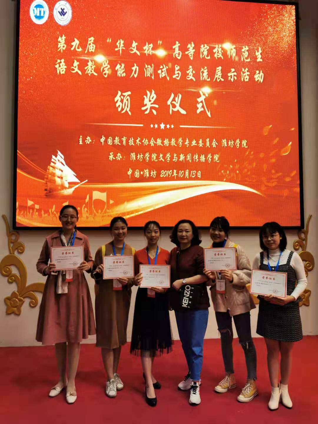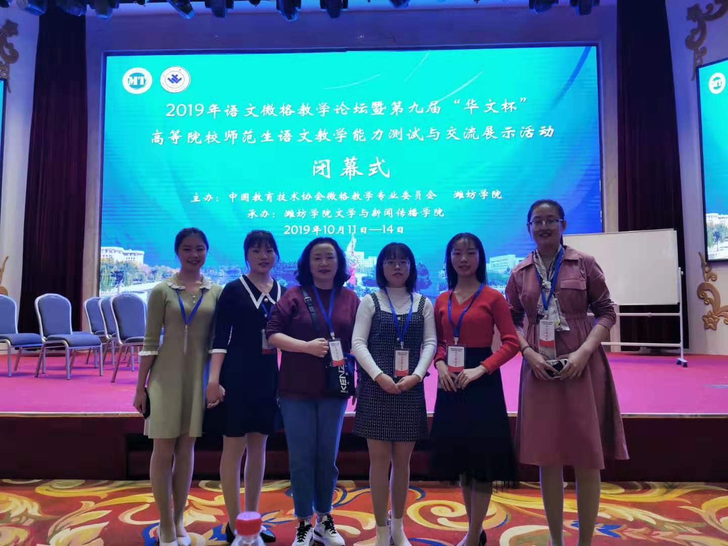 本网讯(文、图/吴峰妤)10月12日至14日,2019年语文微格教学论坛暨第九届“华文杯”高等院校师范生语文教学能力测试与交流展示活动在山东潍坊学院举行。本届测试活动吸引了来自全国近百所高校的498名学生参加。我校教育科学学院选派了5名小学教育专业学生参赛。