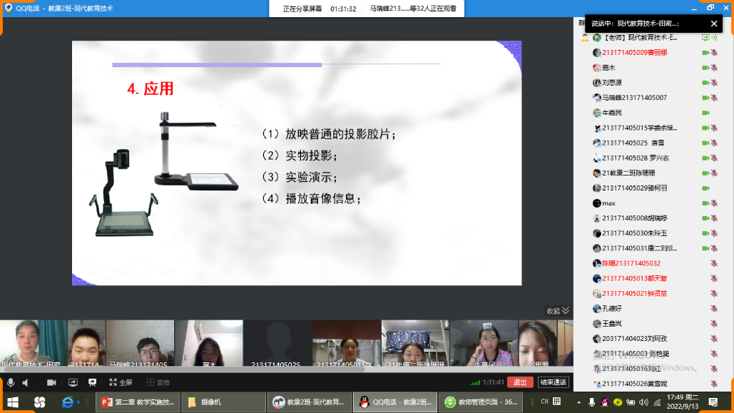 《现代教育技术》线上课程资源已于2021年7月全部升级完善,但是有了2020年春季线上教学的经验,即使是远程学习,对于目前的学生群体来说,还不能完全脱离教师的教,不能完全依赖线上课程资源。如何开展直播课,并合理利用线上资源,将二者相结合,变得尤为重要。这一周课程教学内容主要为“教学媒体技术”,线上资源以操作为主,学生在返校后如何有效的实践,提高实验效率,线上资源就可以发挥重要的作用。所以,我在直播课过程中主要以教学媒体的基础知识介绍为主,使学生对媒体的基本工作原理、性能指标、教学功能、设备维护方法形成初步认知;课后开放本次课线上资源,让学生利用线上视频观摩学习媒体的使用。从而可以为返校后实验室实验操作做好充分的准备,提高实验效率,为更多的学生创设实验的机会,一定程度上可以缓解我们实验室设备少而学生人数多的问题。