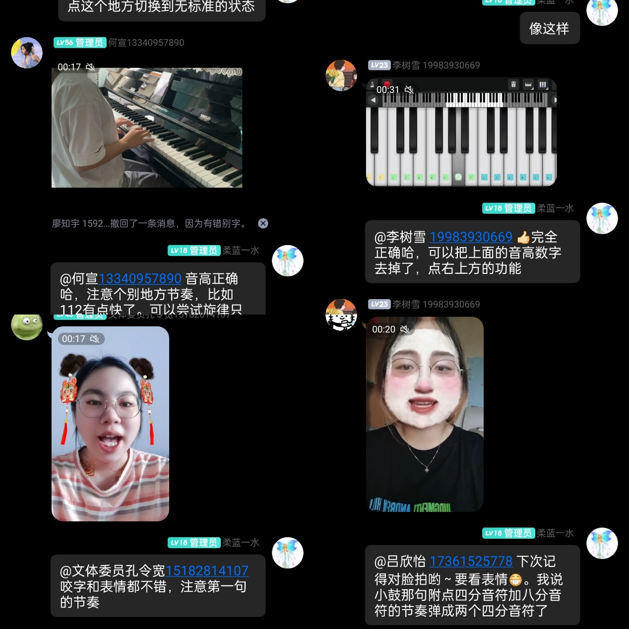 目前,在疫情反复的特殊时期,在线上学习的过程中,针对本门课程的实践性和技能性,为保证每一位学生有质量地参与到课堂当中,本课程通过QQ群、腾讯会议等视频直播形式向学生讲授了儿歌演唱和即兴伴奏的相关理论知识,并通过直观的方式清晰地进行手型以及表情示范。在大部分学生没有钢琴、电子琴等学习设备的情况下,在课堂上引入了钢琴弹奏软件APP,通过APP帮助学生巩固训练在儿歌弹唱中音准和节奏,并在学习过程中注重培养学生的音乐感和表现力。课堂通过视频分享及时检验学生的学习成果,刚开始时,部分同学对于分享演奏演唱视频还有一些腼腆,利用了一些特效遮挡面部表情,对此进行了积极鼓励,并对学生弹唱情况进行了认真点评;通过练习,大部分学生都能够在课堂的线上舞台大胆展示自己的表演。