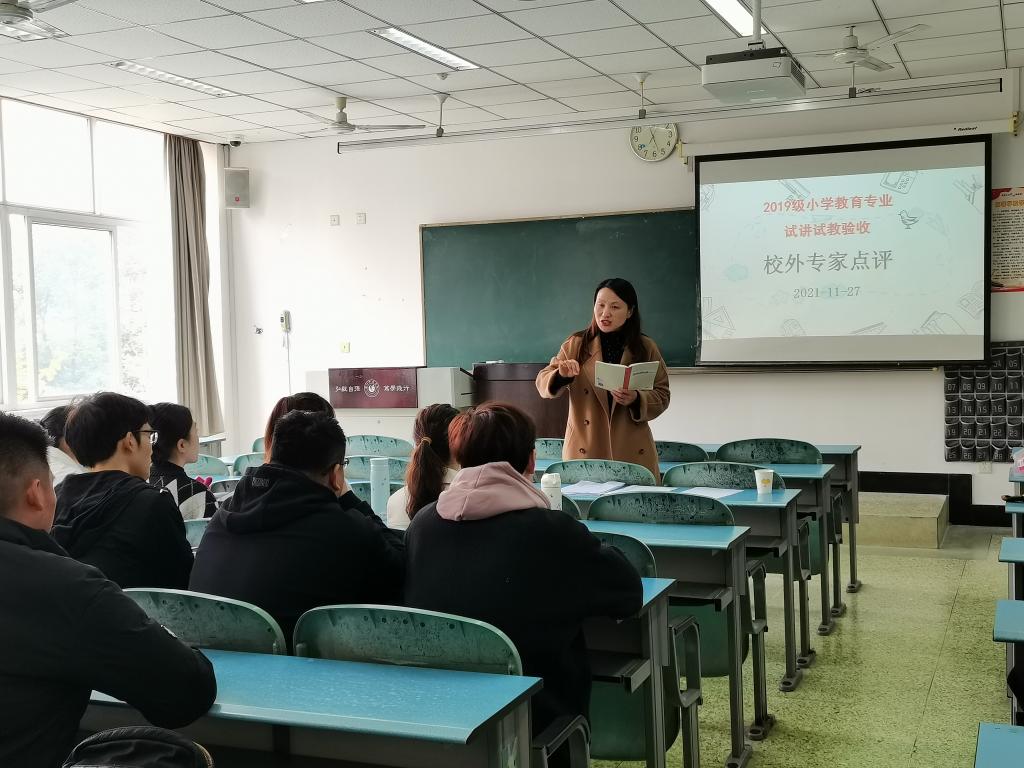 本网讯(文、图/刘佳龙)为提高师范生教育教学能力,检验师范生的理论知识和实操技能,教师教育学院于11月27日开展了2023届(2019级)小教专业试讲试教验收活动。乐师附小张平副校长和刘建波副校长、徐家扁小学李方斌副校长、县街小学李冬梅副校长、教师教育学院副院长唐前军和吴永胜、学前教育专业余祥主任、杨恒老师及小学教育专业部分指导教师参加了本次验收活动。