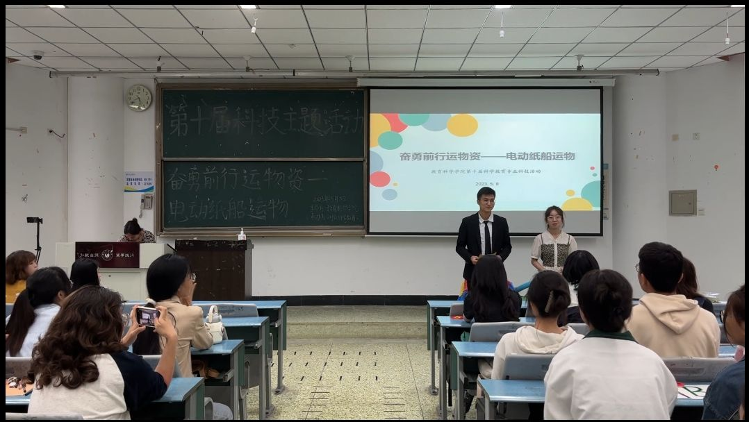 本网讯(文、图/戎媛媛)为进一步培养科学教育专业学子的科学精神和实践创新能力,营造热爱科技、崇尚创新、勇于实践的科创氛围。5月8日,教育科学学院科学教育专业第十届科技活动大赛在行知楼214开展。参与此次科技活动的成员有科学教育专业负责人王朝君,教师张旭梅、叶超,以及20级、21级、22级科学教育专业全体学生。本次活动由黄冶,陈芊主持,分为“纸船设计”“纸船制作”“纸船比赛”“汇报宣讲”四个环节。