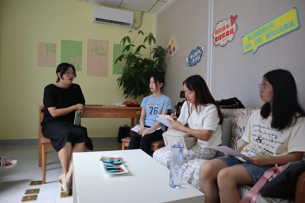 在另一边,陶媛老师又带领心理学系学生来到四川师范大学狮子山校区,与学校心理健康中心负责人罗老师进行调研访谈。罗老师详细介绍了本校心理健康教育中心基本工作内容以及在校学生心理健康情况。双方就学校心理健康教育中心的发展与前景展开了热烈的讨论