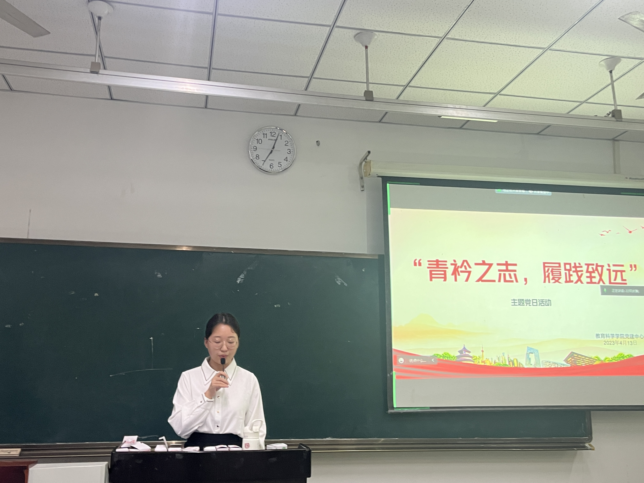 本网讯(文、图/贺夏莲)为学习优秀党员的教育思想,增强学生党员的师德修养,4月13日下午教育科学学院党建中心于行知楼开展了“青衿之志,履践致远”主题党日活动。教育科学学院全体学生党员参加了本次活动,此次活动由邓庆琳主持。