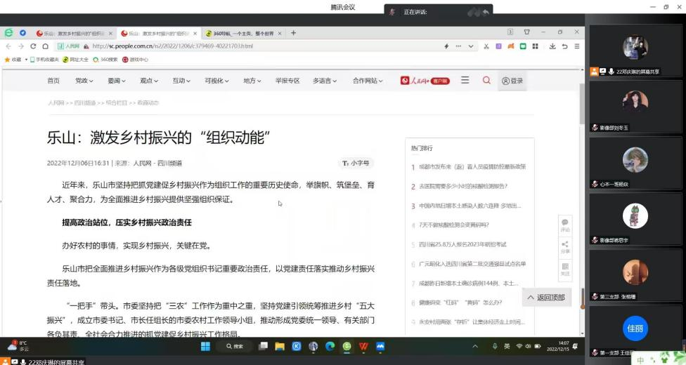 本网讯(文/杨焱、图/刘冬玉)为了帮助青年党员们更加了解乡村振兴战略,助力实现乡村振兴的发展,为乡村振兴保驾护航。12月15日下午,教育科学学院党建中心组织学院学生党支部党员以线上的形式,开展“投身乡村振兴,助力健康中国”主题党日活动。本次活动由邓庆琳主持。