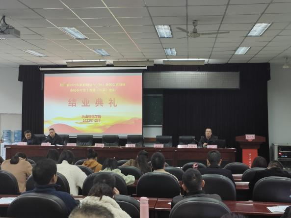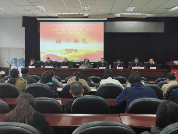 本网讯(文、图/张广云)12月1日上午,有乐山ty8天游平台登录承办的“四川省2022年教师培训市(州)统筹实施项目——农村骨干教师能力提升培训”线下结业典礼在弘毅楼413教室顺利进行。教育科学学院院长汪红烨,党委书记罗立顺,党委副书记和何晓军,副院长徐世鼎、唐前军及首席执行专家张广云、班主任孙来成、杨林和来自乐山市各区县的50名7年以上教龄的小学骨干教师参加了此次结业典礼,徐世鼎主持结业典礼。