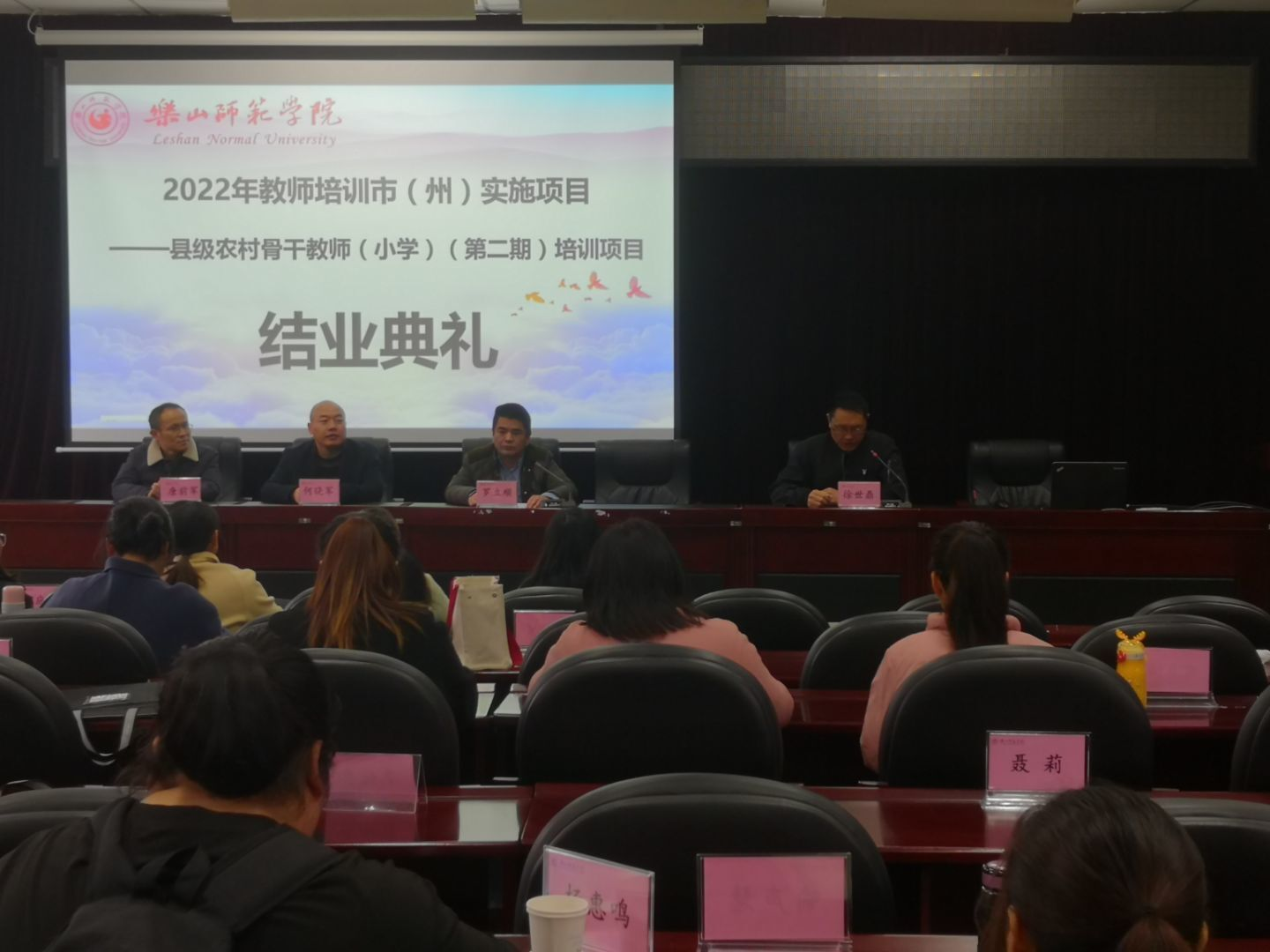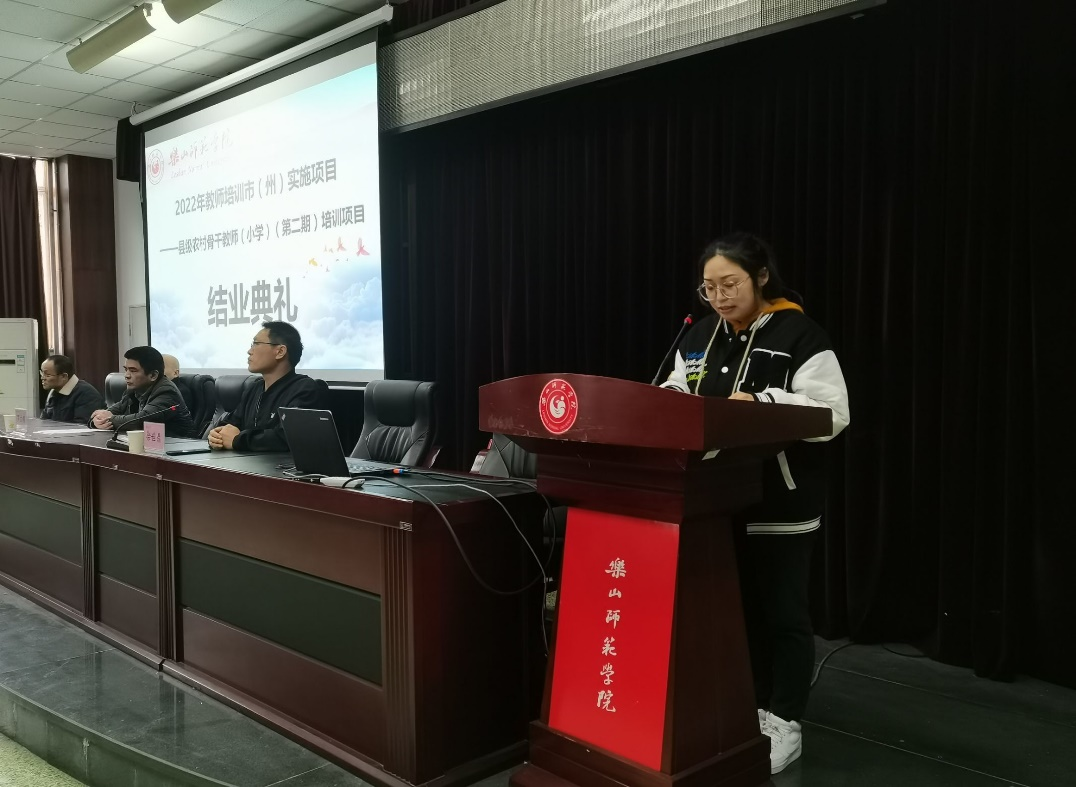 本网讯(文/冯紫君、图/雷仕美、缑月娇、蒲绍东)3月28日,2022年“国培项目”市(州)实施项目——县级农村骨干小学教师培训(第二期)结业典礼在弘毅楼413教室顺利举行。乐山ty8天游平台登录党委书记罗立顺、党委副书记兼纪委书记何晓军、副院长徐世鼎、唐前军、教学班主任廖娅晖及47名学员参加了结业典礼。结业典礼由徐世鼎主持。