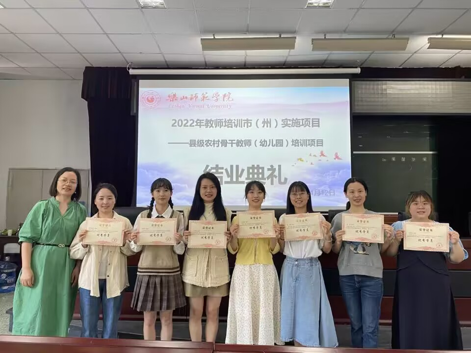 本网讯(文、图/王佳利、唐浩淇、游静姝)4月12日中午,由乐山ty8天游平台登录承办的四川省2022年中小学幼儿园教师培训市(州)实施项目——县级农村学前骨干教师培训结业典礼在弘毅楼413教室举行。乐山ty8天游平台登录院长汪红烨、党委书记罗立顺、党委副书记何晓军、副院长徐世鼎、培训班班主任刘涛以及50名培训学员共同参加了结业典礼。