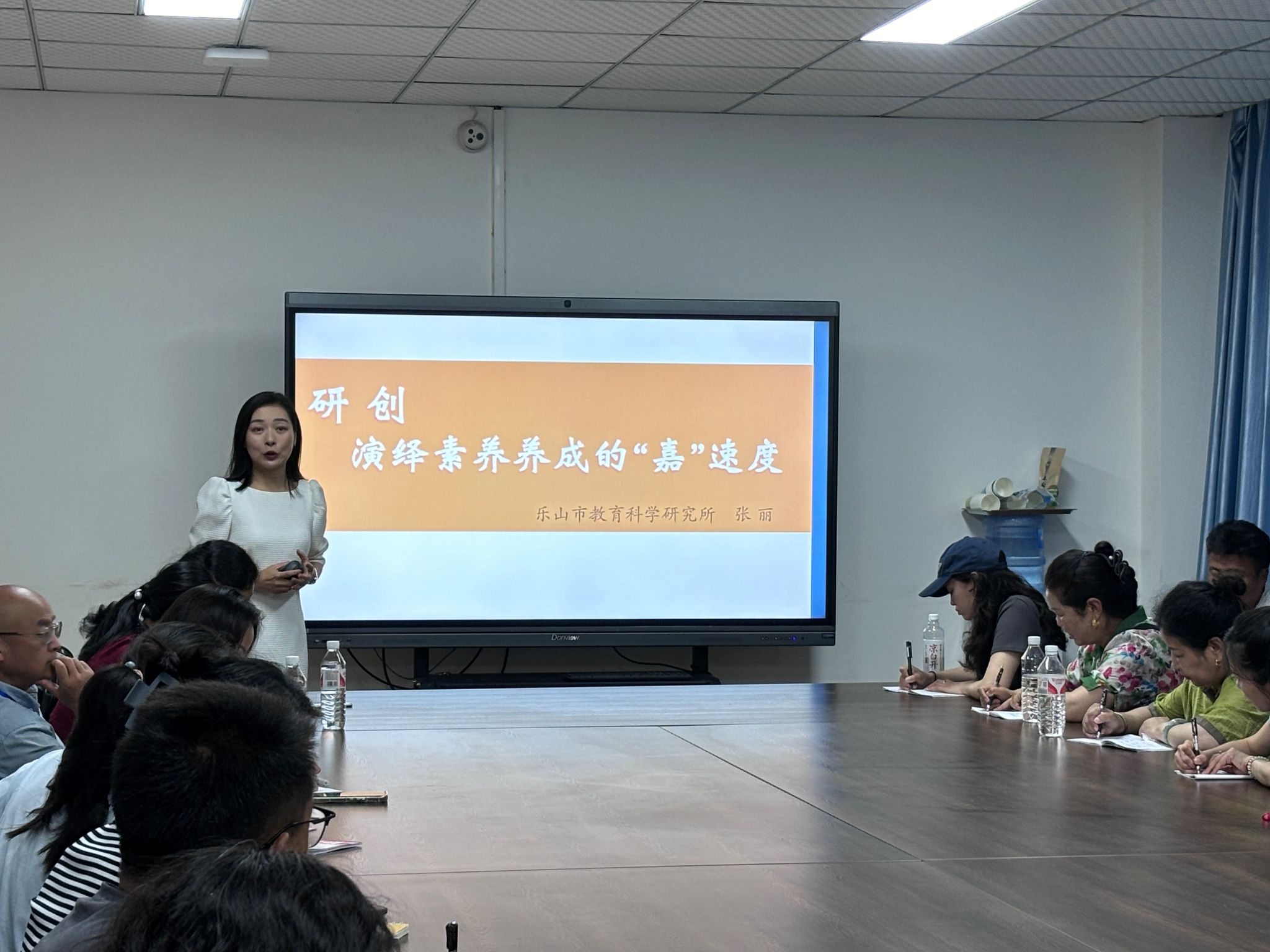 乐山市教科所办公室主任张丽老师代表乐山市教科所欢迎甘孜州的培训学员,她以《研创—演绎素养养成的“嘉”速度》为主题,对乐山市“研创学习”研究、实践历程中个人的经验和心得体会进行分享,从组建团队到如何与联系学校落实常态化执行,跟进学校实践改进。她提出要不断创新学习理论,跟进研发样例,从而成功实现成果转化。张丽老师特别提到了在2020年对乐山各联系学校进行了教学视导,从研创教研开始,以创生关键能力为主题,将以前的教研组某一位老师展示课程的形式创新为教研组团队的展示,提升各位老师的参与感、成就感,以主题研修带动了校本教研。