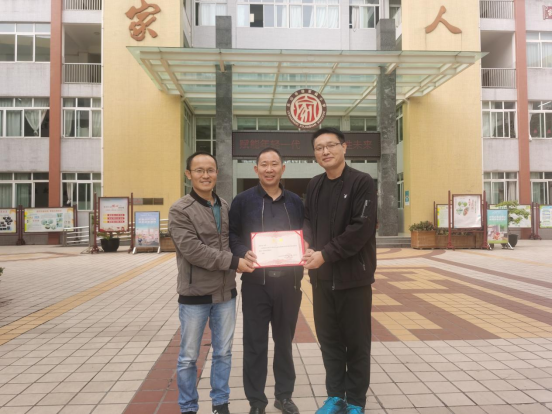 图为唐前军、徐世鼎为实验中学谭俊校长颁发聘书