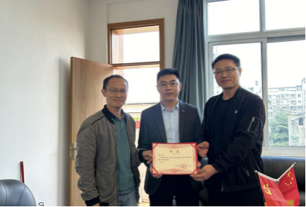 图为唐前军、徐世鼎为徐家扁小学李方斌校长颁发聘书
