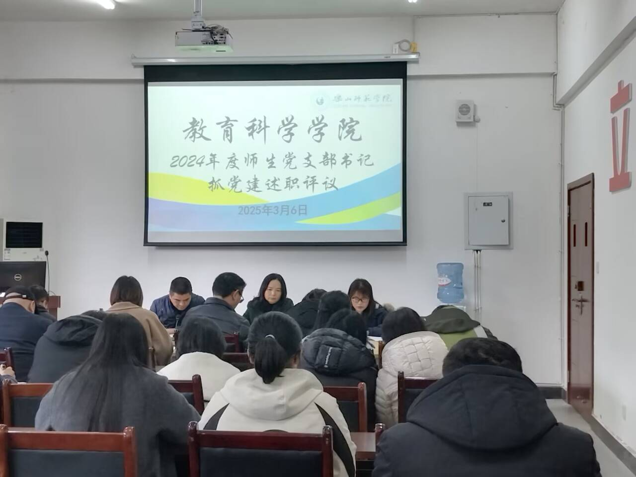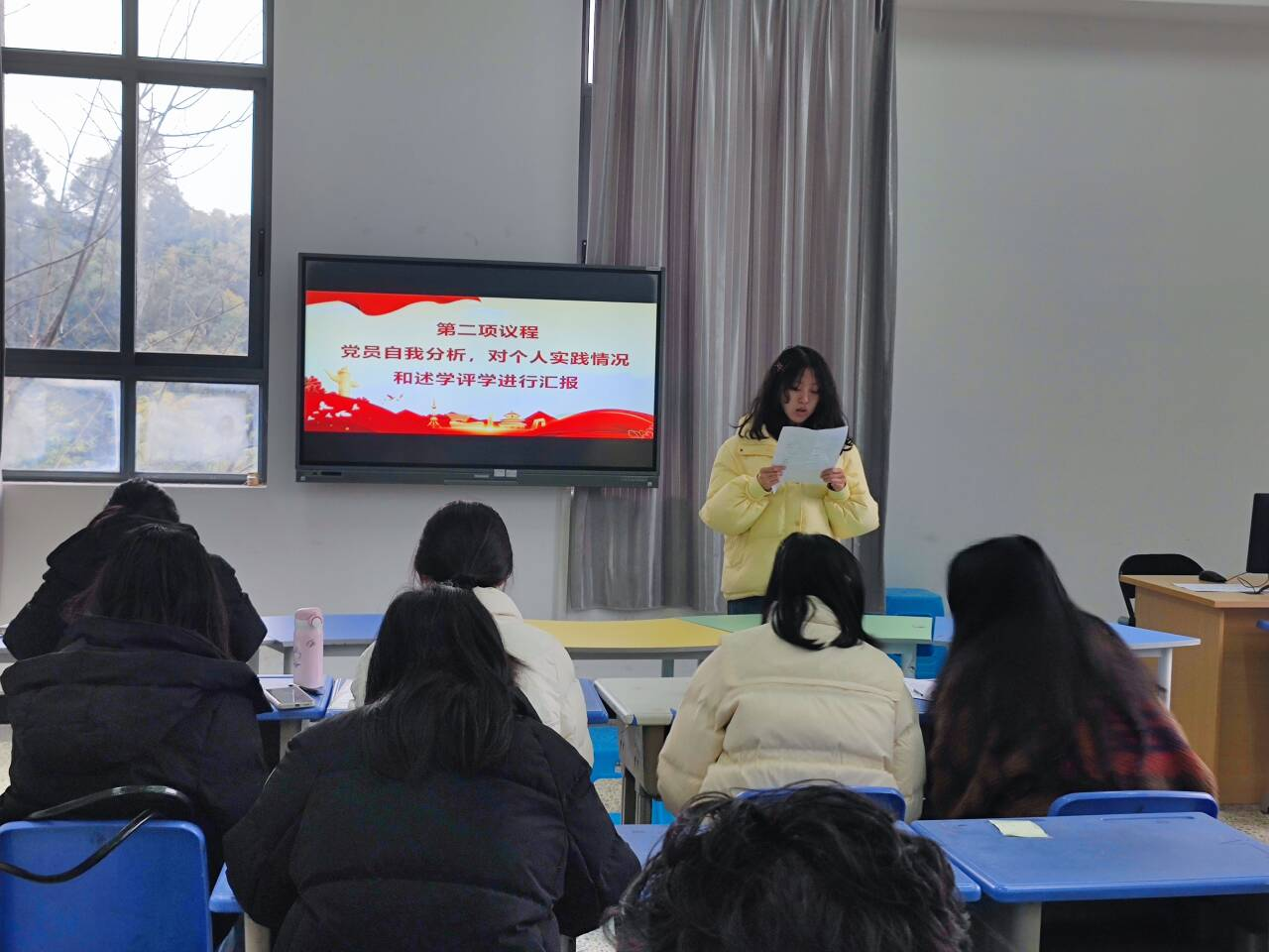 罗立顺主持各支部书记依次展开述职,教职工第一、第二党支部围绕教职工党建工作和教学科研工作,汇报了基层党支部的建设情况和党员教师学习、工作的主要情况。第一教职工党支部书记廖华平讲到,2024年支部为学院各项重要工作提供坚实的政治保障和组织支持,成立了“小学教育专业硕士点建设党员攻坚队”、“师范专业认证党员先锋岗”,支部党员教师积极充当“主力军”,推动工作顺利进行。第二教职工党支部书记王立新讲到,在党建引领下,支部教师在教学科研和学科竞赛指导方面都取得了显著成果,支部党员教师全年共成功申报省部级项目2项、市厅级项目多项,并指导心理学专业学生在“挑战杯”比赛、全国心理与行为在线实验精英赛等赛事中荣获佳绩。同时,在峨眉一中、乐山一中、草堂高中等学校多次开展心理健康教育方面的地方服务工作。教职工党支部也分析了一年工作中存在的不足,并深入思考了改进方向。第一、第二、第三学生党支部汇报了学生党支部在学生党员培养和发展、基层党组织建设、党日活动开展、学生党员思想政治教育等方面的工作。第一学生党支部书记杨蕾讲到,2024年支部切实加强党员管理,在发展党员工作中严格把好“入口关”,做好入党积极分子培训工作,加强对预备党员的培养和考察,以提高学生党员队伍的素质。第二学生党支部书记童瑶提到,支部将在新一年工作中继续做好党建工作深入服务学生,创新党建工作方式,形成党建工作品牌,着力推动支部建设全面进步、全面过硬。第三学生党支部书记朱志刚谈到,2024年支部始终围绕着党建促团建、团建促学风的工作思路,扎实推进学生党员的思想政治教育,不断增强学生党员的先进性和纯洁性。