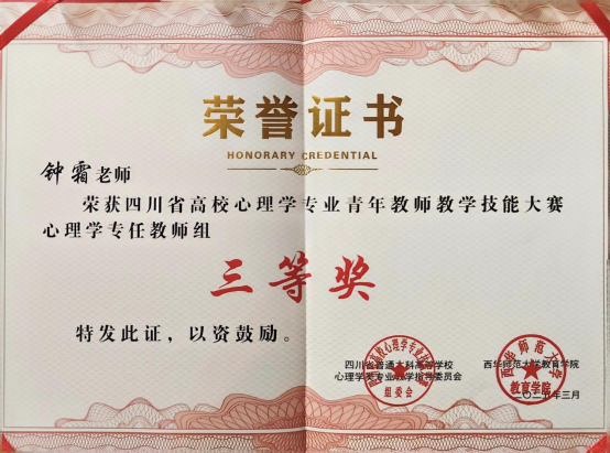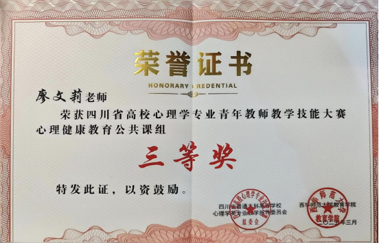 本次大赛旨在进一步加强高校心理学专业青年教师队伍建设,助力高等教育高质量发展,加快推进教育强省建设,提升心理学教育教学水平,推动专业发展,吸引了省内众多高校的心理学专业教师积极参与。大赛分为心理学专任教师组和心理健康教育公共课教师组两个组别,我校按照大赛要求通过选拔,每个组别各推荐1名教师参加决赛。大赛以“上好一门课”为竞赛理念,设置了多个环节,包括说课、课堂教学和评委提问等,经过紧张而激烈的角逐,我院心理学专业钟霜老师荣获心理学专任教师组三等奖,廖文莉老师荣获心理健康教育公共课教师组三等奖。