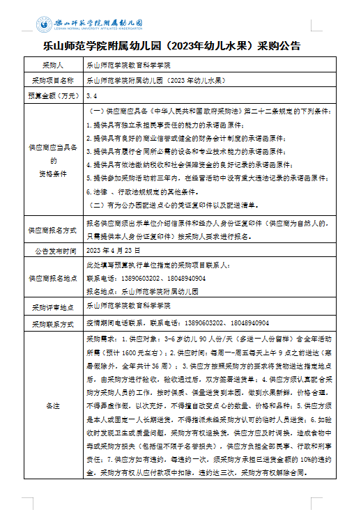 乐山师范学院附属幼儿园(2023年幼儿水果)采购公告