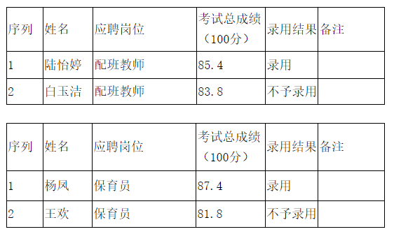 经教师教育学院研究,本次招聘拟录用配班教师1名、保育员1名,参加体检人员名单如下: