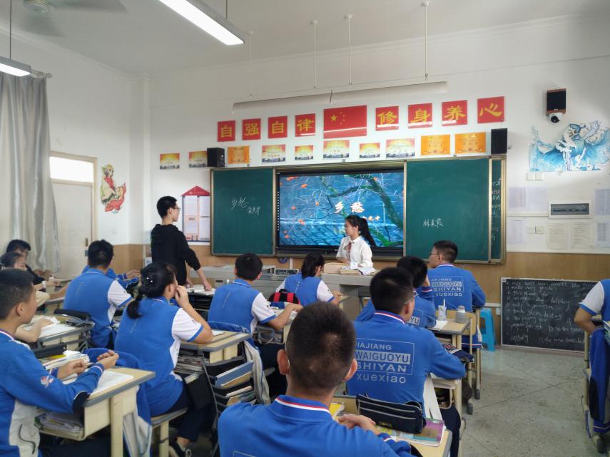 本网讯(文、图/王静)9月21日到25日,乐山师范学院实习带队老师王静分别到夹江外国语实验学校、夹江县云吟职业中学校、夹江县第一中学校和夹江中学校学习、听课、指导。夹江外国语实验学校的实习学生谭霜、孙鑫慧和林美霞分别于9月21日、9月23和9月24日走上讲台,开始了他们教学事业的第一课。