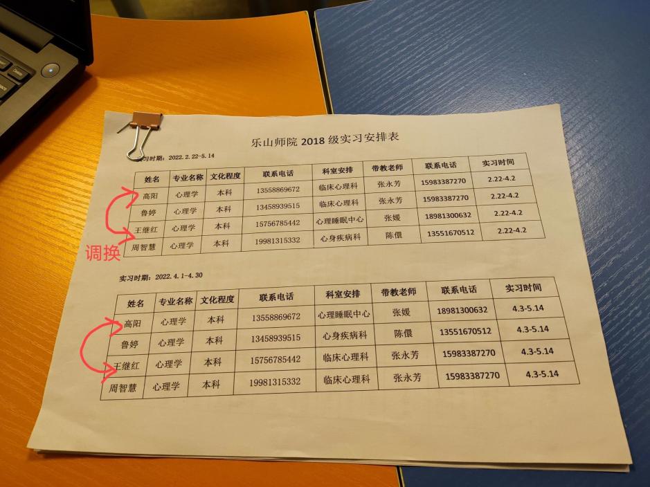 本网讯(文/高阳、图周智慧)学以致用、用以促学、学用相长,理论必须在实践中才能彰显光芒。为进一步巩固专业理论知识,拓展学生视野,提高学生社会实践能力,创新人才培养模式,2022年2月22日乐山师范学院教师教育学院心理学专业4名同学由专任实习教师罗茜倩老师带队来到乐山市精神病院实习。医教科程科长亲自接待实习生们,对医院的规章制度和需要注意的事项予以讲解,并讲授了精神科相关理论及心理学知识,程科长对实习生们提出了要求和期许,希望实习生们尽快调整心态,转换角色,尽快适应新的工作岗位,对待工作要有耐心、责任心、勤于实践、发挥才干、迈好坚实的每一步,不断积累经验。随后,程科长把实习生们分派到各个岗位。